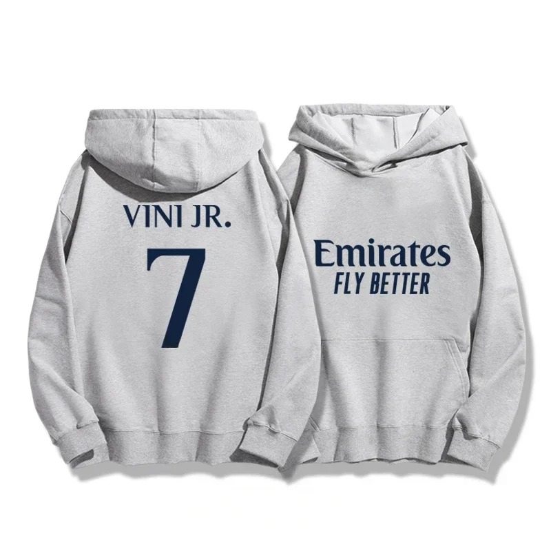Ta, męska bluza to idealne połączenie sportowego ducha i codziennego komfortu. Zaprojektowana z myślą o fanach, którzy cenią jakość i styl. Na plecach znajduje się wysokiej jakości nadruk "Vini Jr 7", a przód zdobi logo "Emirates Fly Better". To nie tylko ubranie, to deklaracja pasji.